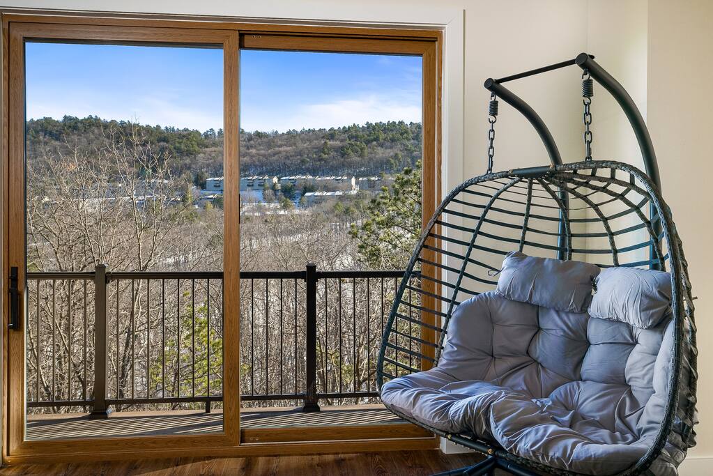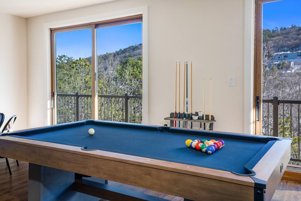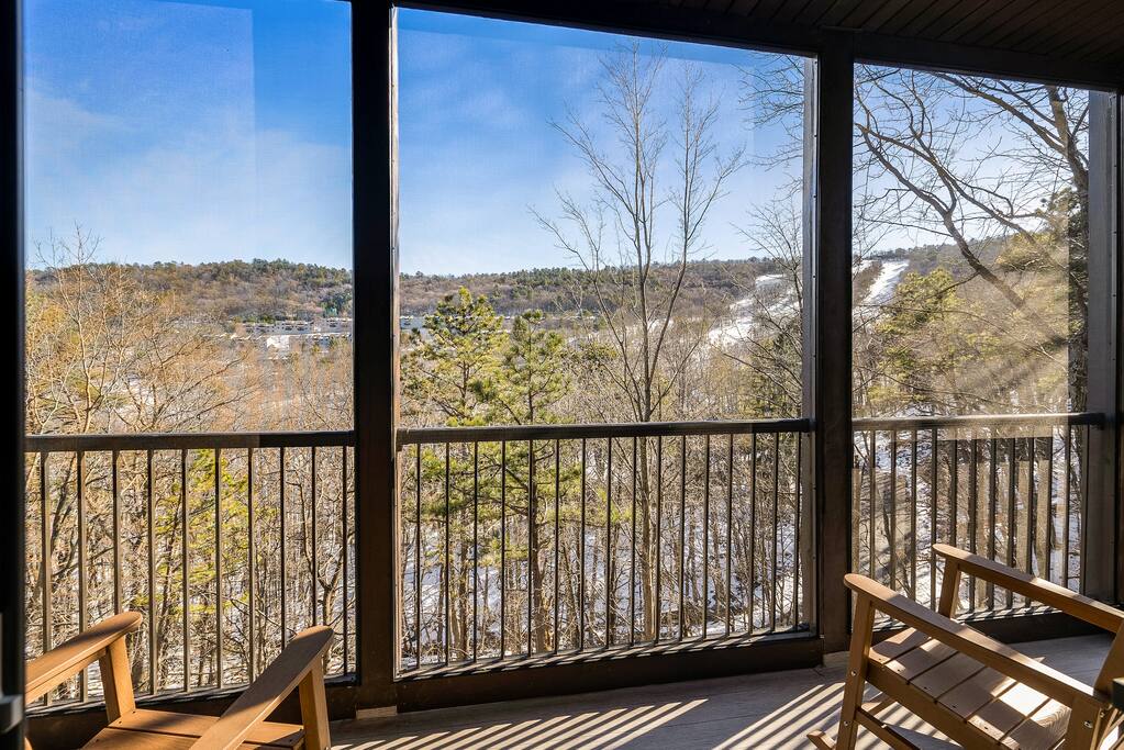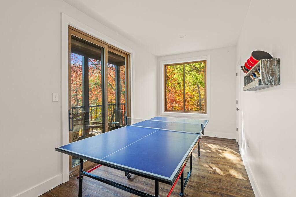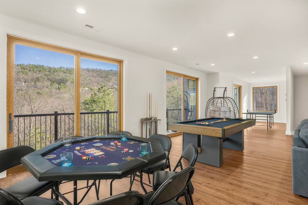 Casador is Romanian for "the house you will miss,” and is a one-of-a-kind hawk-shaped home designed and built by the owner. There are stunning views from most rooms in the home, the screened in porch, the hot tub deck, and both wrap-around decks. Casador is about a 3 minute drive to the slopes, pool, and dining at Massanutten and just 10 minutes to the indoor/outdoor Waterpark. The Swift Run Gap entrance to Shenandoah National Park is 20 minutes away with some of the best hiking on the east coast. JMU and everything else in Harrisonburg is 25 minutes away, and there are several breweries, wineries, and restaurants within 20 minutes of the house. The home layout is as follows: Top floor (this is the floor you enter from the driveway / main entrance): - Open concept living room with massive sectional, TV, electric fireplace, and ski slope views - Dining area with seating for 14 at the table, plus another 4 at the kitchen bar - Gourmet kitchen with brand new stainless appliances, large island with bar seating, two sinks, and two dishwashers - Screened in porch with outdoor dining for 12, lounge seating area, and Blackstone griddle, all overlooking the mountains - Wrap-around balcony outside - BR1: master bedroom with queen bed, balcony access, and ensuite bathroom with double vanities and soaking tub - BR2: queen bedroom with balcony access - Hall full bath Middle floor: - Additional living room / game room with big screen TV, pool table, ping pong, arcade games, and a poker table - Kitchenette with additional fridge, dishwasher, and microwave - Screened in porch with rocking chairs - Wrap-around balcony outside - BR3: master bedroom with queen bed, balcony access, and ensuite bathroom with double vanity - BR4: queen bedroom with balcony access - Hall full bath - BR5: queen bedroom - BR6: Bunk bedroom with 2 sets of twin-over-full futon bunk beds - Jack and Jill full bath between BR5 and BR6, with double vanity and soaker tub Bottom floor: - Deck with brand new hot tub, sauna, outdoor dining, and grill - Kitchenette with refrigerator, dishwasher, and microwave - Laundry room - Half bath