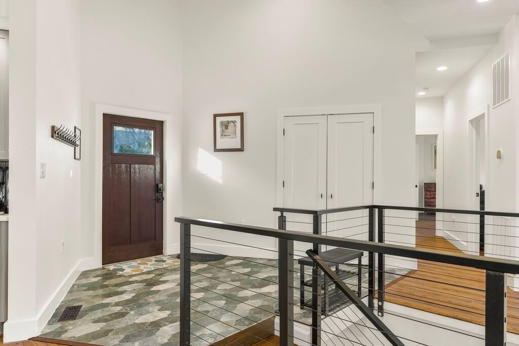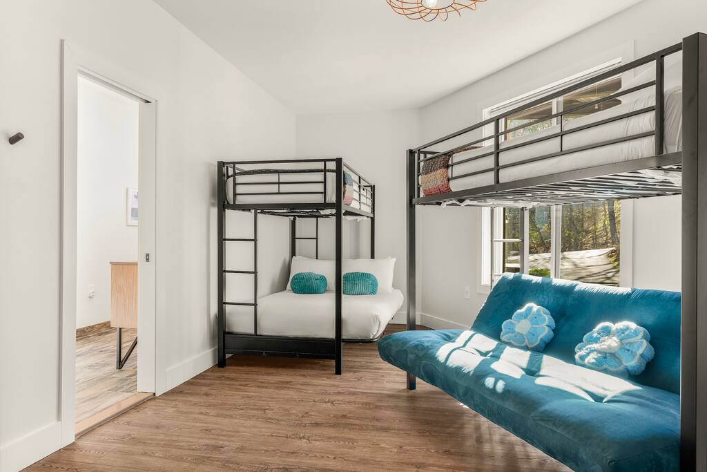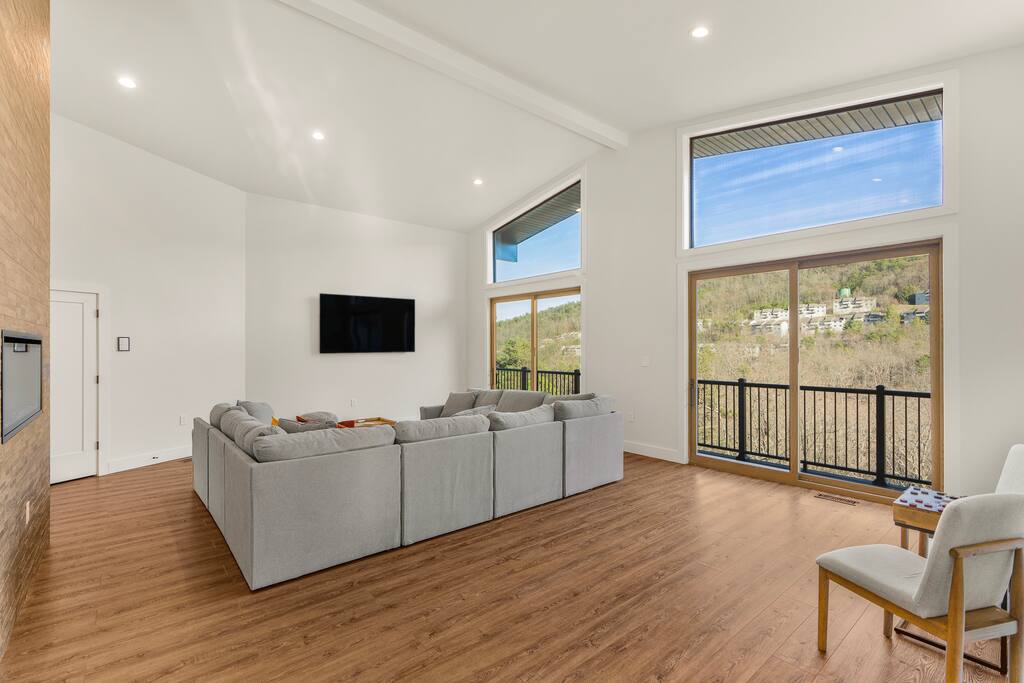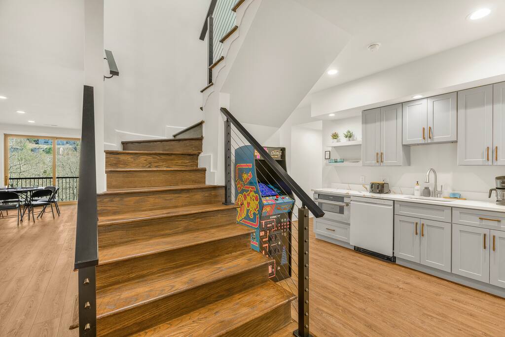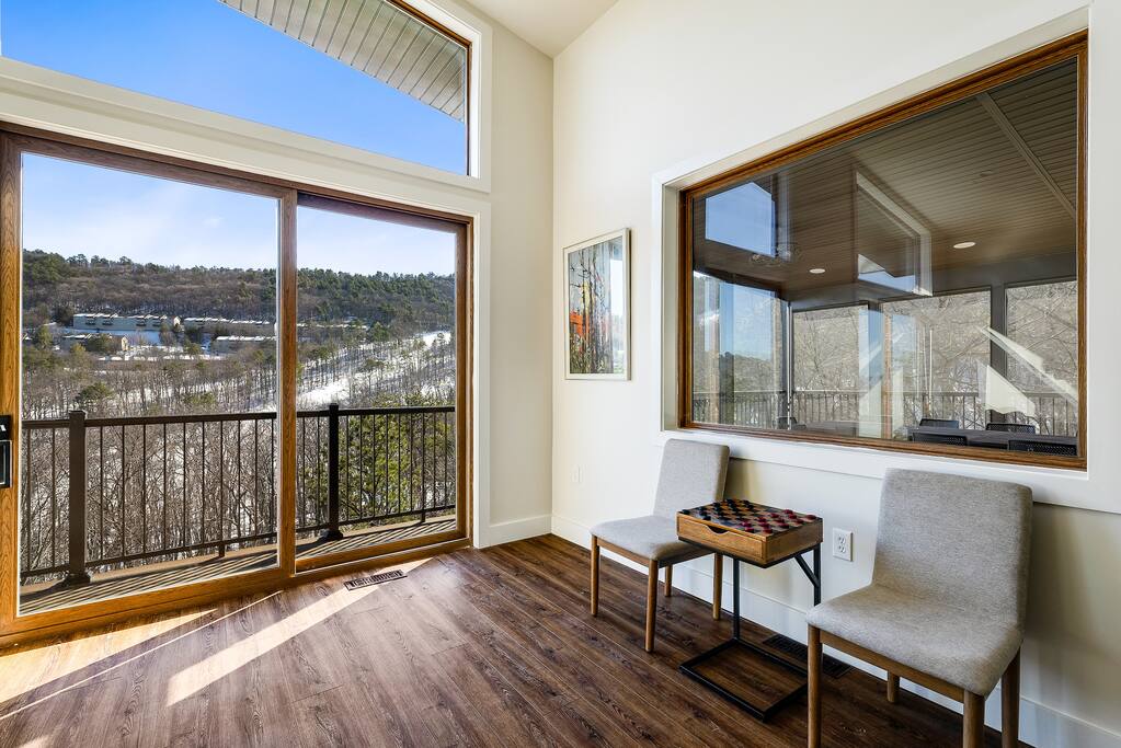 Casador is Romanian for "the house you will miss,” and is a one-of-a-kind hawk-shaped home designed and built by the owner. There are stunning views from most rooms in the home, the screened in porch, the hot tub deck, and both wrap-around decks. Casador is about a 3 minute drive to the slopes, pool, and dining at Massanutten and just 10 minutes to the indoor/outdoor Waterpark. The Swift Run Gap entrance to Shenandoah National Park is 20 minutes away with some of the best hiking on the east coast. JMU and everything else in Harrisonburg is 25 minutes away, and there are several breweries, wineries, and restaurants within 20 minutes of the house. The home layout is as follows: Top floor (this is the floor you enter from the driveway / main entrance): - Open concept living room with massive sectional, TV, electric fireplace, and ski slope views - Dining area with seating for 14 at the table, plus another 4 at the kitchen bar - Gourmet kitchen with brand new stainless appliances, large island with bar seating, two sinks, and two dishwashers - Screened in porch with outdoor dining for 12, lounge seating area, and Blackstone griddle, all overlooking the mountains - Wrap-around balcony outside - BR1: master bedroom with queen bed, balcony access, and ensuite bathroom with double vanities and soaking tub - BR2: queen bedroom with balcony access - Hall full bath Middle floor: - Additional living room / game room with big screen TV, pool table, ping pong, arcade games, and a poker table - Kitchenette with additional fridge, dishwasher, and microwave - Screened in porch with rocking chairs - Wrap-around balcony outside - BR3: master bedroom with queen bed, balcony access, and ensuite bathroom with double vanity - BR4: queen bedroom with balcony access - Hall full bath - BR5: queen bedroom - BR6: Bunk bedroom with 2 sets of twin-over-full futon bunk beds - Jack and Jill full bath between BR5 and BR6, with double vanity and soaker tub Bottom floor: - Deck with brand new hot tub, sauna, outdoor dining, and grill - Kitchenette with refrigerator, dishwasher, and microwave - Laundry room - Half bath